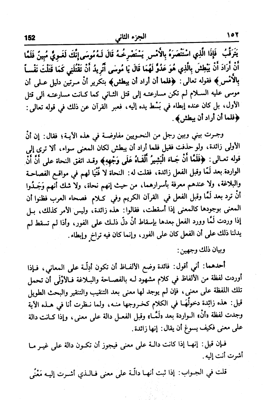 وقد اتفق النحاة على أنّ أن الواردة بعد لمّا وقبل الفعل زائدة، فقلت له: النحاة لا فتيا لهم في مواقع الفصاحة والبلاغة، ولا عندهم معرفة بأسرارهما، من حيث إنهم نحاة، ولا شك أنهم وجدوا أن ترد بعد لمّا وقبل الفعل في القرآن الكريم وفي كلام فصحاء العرب فظنوا أن المعنى بوجودها كالمعنى إذا أسقطت، فقالوا: هذه زائدة، وليس الأمر كذلك، بل إذا وردت لمّا وورد الفعل بعدها بإسقاط أن دلّ ذلك على الفور، وأذا لم تسقط لم يدلنا ذلك على أن الفعل كان على الفور، وإنما كان فيه تراخ وإبطاء.
