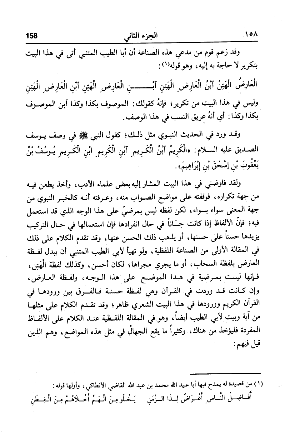 ولقد فاوضني في هذا البيت المشار إليه بعض علماء الأدب، وأخذ يطعن فيه من جهة تكراره، فوقفته على مواضع الصواب منه، وعرفته أنه كالخبر النبوي من جهة المعنى سواء بسواء، لكن لفظه ليس بمرضيّ على هذا الوجه الذي قد استعمل فيه؛ فإنّ الألفاظ إذا كانت حسانا في حال انفرادها فإن استعمالها في حال التركيب يزيدها حسنا على حسنها، أو يذهب ذلك الحسن عنها، وقد تقدم الكلام على ذلك في المقالة الأولى من الصناعة اللفظية، ولو تهيأ لأبي الطيب المتنبي أن يبدل لفظة العارض بلفظة السحاب، أو ما يجري مجراها؛ لكان أحسن، وكذلك لفظة الهتن، فإنها ليست بمرضية في هذا الموضع على هذا الوجه، ولفظة العارض، وإن كانت قد وردت في القرآن وهي لفظة حسنة فالفرق بين ورودها في القرآن الكريم وورودها في هذا البيت الشعري ظاهر؛ وقد تقدم الكلام على مثلها من آية وبيت لأبي الطيب أيضا، وهو في المقالة اللفظية عند الكلام على الألفاظ المفردة فليؤخذ من هناك، وكثيرا ما يقع الجهال في مثل هذه المواضع، وهم الذين قيل فيهم: