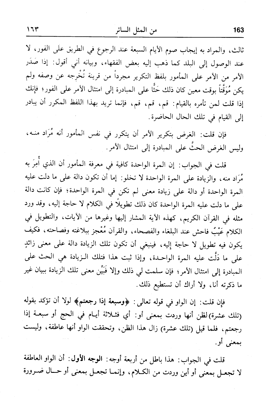 ثالث، والمراد به إيجاب صوم الأيام السبعة عند الرجوع في الطريق على الفور، لا عند الوصول إلى البلد كما ذهب إليه بعض الفقهاء، وبيانه أني أقول: إذا صدر الأمر من الأمر على المأمور بلفظ التكرير مجردا من قرينة تخرجه عن وصفه ولم يكن موقّتا بوقت معين كان ذلك حثّا على المبادرة إلى امتثال الأمر على الفور؛ فإنك إذا قلت لمن تأمره بالقيام: قم، قم، قم، فإنما تريد بهذا اللفظ المكرر أن يبادر إلى القيام في تلك الحال الحاضرة.