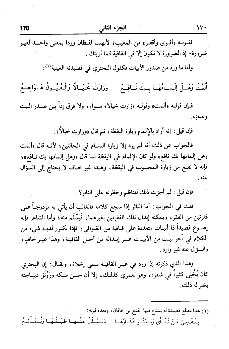قلت في الجواب: أما الناثر إذا سجع كلامه فالغالب أن يأتي به مزدوجا على فقرتين من الفقر، ويمكنه إبدال تلك الفقرتين بغيرهما، فيسلم منه؛ وأما الشاعر فإنه يصوغ قصيدا ذا أبيات متعددة على قافية من القوافي؛ فإذا تكرر لديه شيء من الكلام في آخر بيت من الأبيات عسر إبداله من أجل القافية، وهذا غير خاف، والسؤال عنه غير وارد.