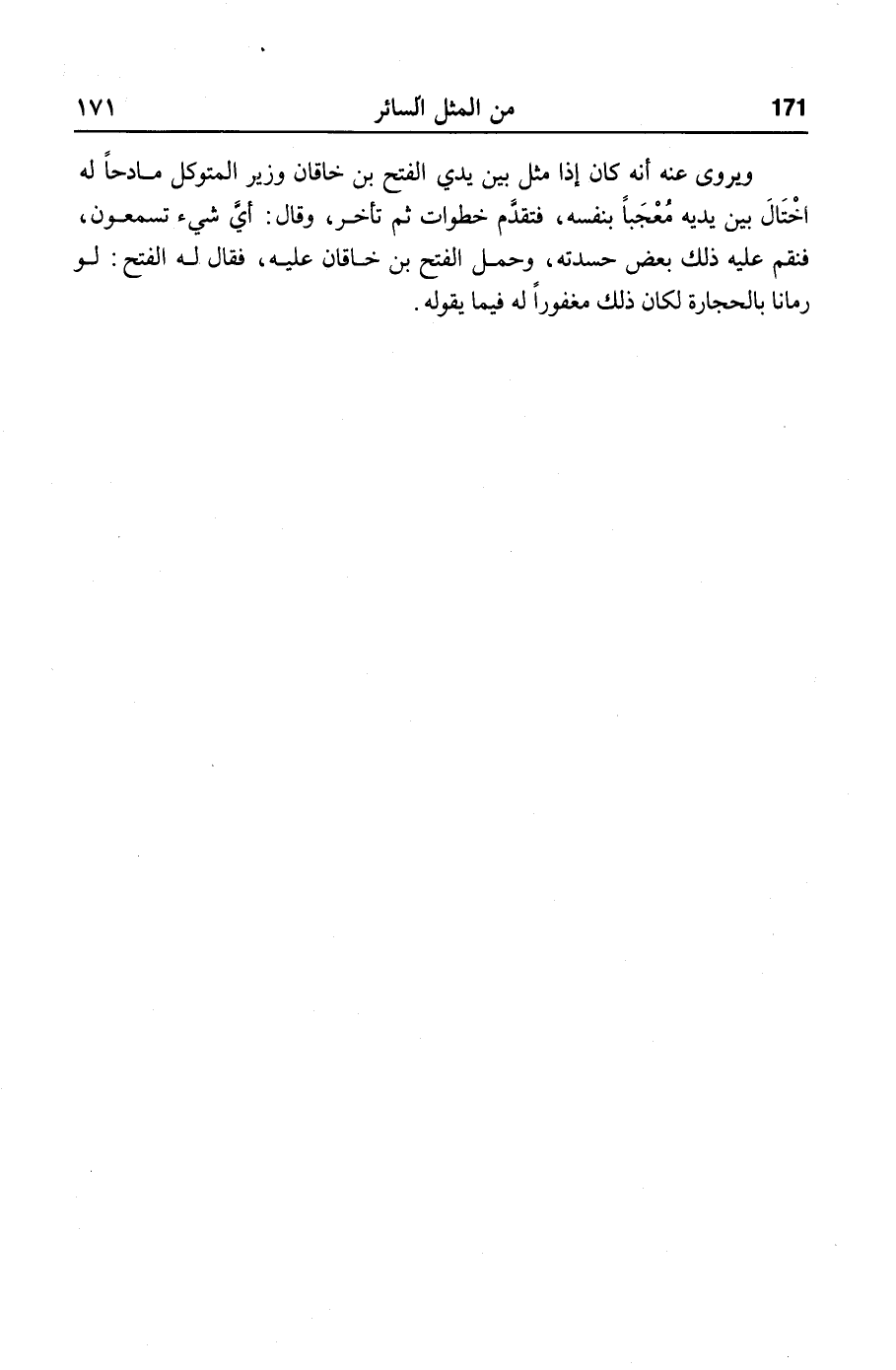 ويروى عنه أنه كان إذا مثل بين يدي الفتح بن خاقان وزير المتوكل مادحا له اختال بين يديه معجبا بنفسه، فتقدّم خطوات ثم تأخر، وقال: أيّ شيء تسمعون، فنقم عليه ذلك بعض حسدته، وحمل الفتح بن خاقان عليه، فقال له الفتح: لو رمانا بالحجارة لكان ذلك مغفورا له فيما يقوله.