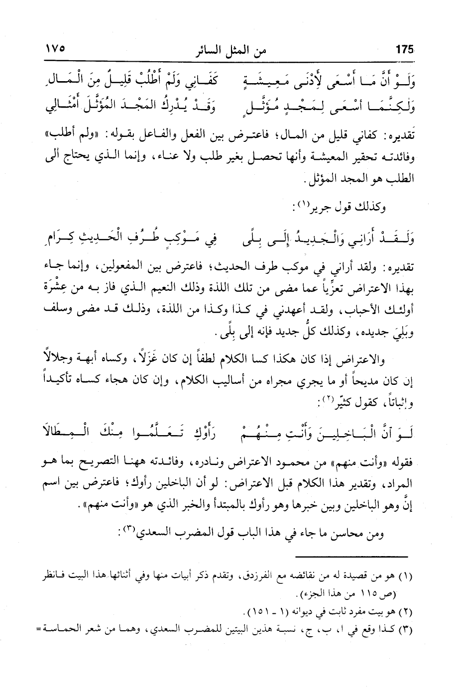 والاعتراض إذا كان هكذا كسا الكلام لطفا إن كان غزلا، وكساه أبهة وجلالا إن كان مديحا أو ما يجري مجراه من أساليب الكلام، وإن كان هجاء كساه تأكيدا وإثباتا، كقول كثّير «2» :