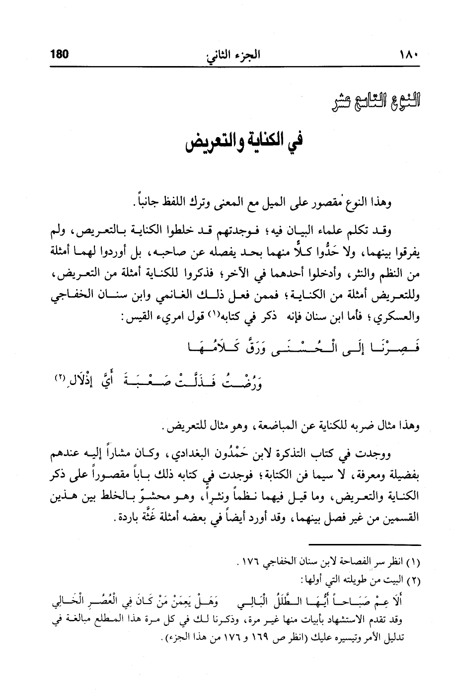 وقد تكلم علماء البيان فيه؛ فوجدتهم قد خلطوا الكناية بالتعريص، ولم يفرقوا بينهما، ولا حدّوا كلّا منهما بحد يفصله عن صاحبه، بل أوردوا لهما أمثلة من النظم والنثر، وأدخلوا أحدهما في الآخر؛ فذكروا للكناية أمثلة من التعريض، وللتعريض أمثلة من الكناية؛ فممن فعل ذلك الغانمي وابن سنان الخفاجي والعسكري؛ فأما ابن سنان فإنه ذكر في كتابه «1» قول امريء القيس: