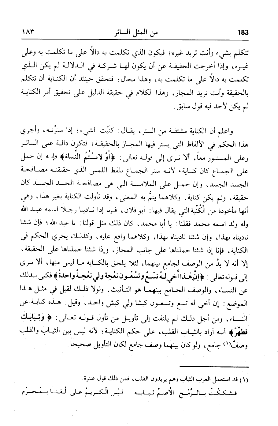 فإنه إن حمل على الجماع كان كناية؛ لأنه ستر الجماع بلفظ اللمس الذي حقيقته مصافحة الجسد الجسد، وإن حمل على الملامسة التي هي مصافحة الجسد الجسد كان حقيقة، ولم يكن كناية، وكلاهما يتمّ به المعنى، وقد تأولت الكناية بغير هذا، وهي أنها مأخوذة من الكنية التي يقال فيها: أبو فلان، فإنا إذا نادينا رجلا اسمه عبد الله وله ولد اسمه محمد فقلنا: يا أبا محمد، كان ذلك مثل قولنا: يا عبد الله؛ فإن شئنا ناديناه بهذا، وإن شئنا ناديناه بهذا، وكلاهما واقع عليه، وكذلك يجري الحكم في الكناية، فإنا إذا شئنا حملناها على جانب المجاز، وإذا شئنا حملناها على الحقيقة، إلا أنه لا بدّ من الوصف لجامع بينهما، لئلا يلحق بالكناية ما ليس منها، ألا ترى إلى قوله تعالى: إن هذا أخي له تسع وتسعون نعجة ولي نعجة واحدة