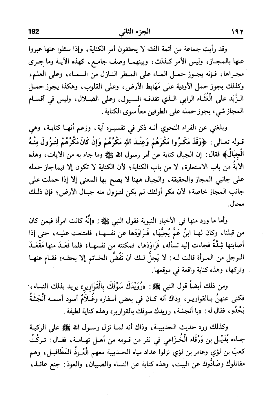 وقد رأيت جماعة من أئمة الفقه لا يحققون أمر الكناية، وإذا سئلوا عنها عبروا عنها بالمجاز، وليس الأمر كذلك، وبينهما وصف جامع، كهذه الآية وما جرى مجراها، فإنه يجوز حمل الماء على المطر النازل من السماء، وعلى العلم، وكذلك يجوز حمل الأودية على مهابط الأرض، وعلى القلوب، وهكذا يجوز حمل الزّبد على الغثاء الرابي الذي تقذفه السيول، وعلى الضلال، وليس في أقسام المجاز شيء يجوز حمله على الطرفين معا سوى الكناية.