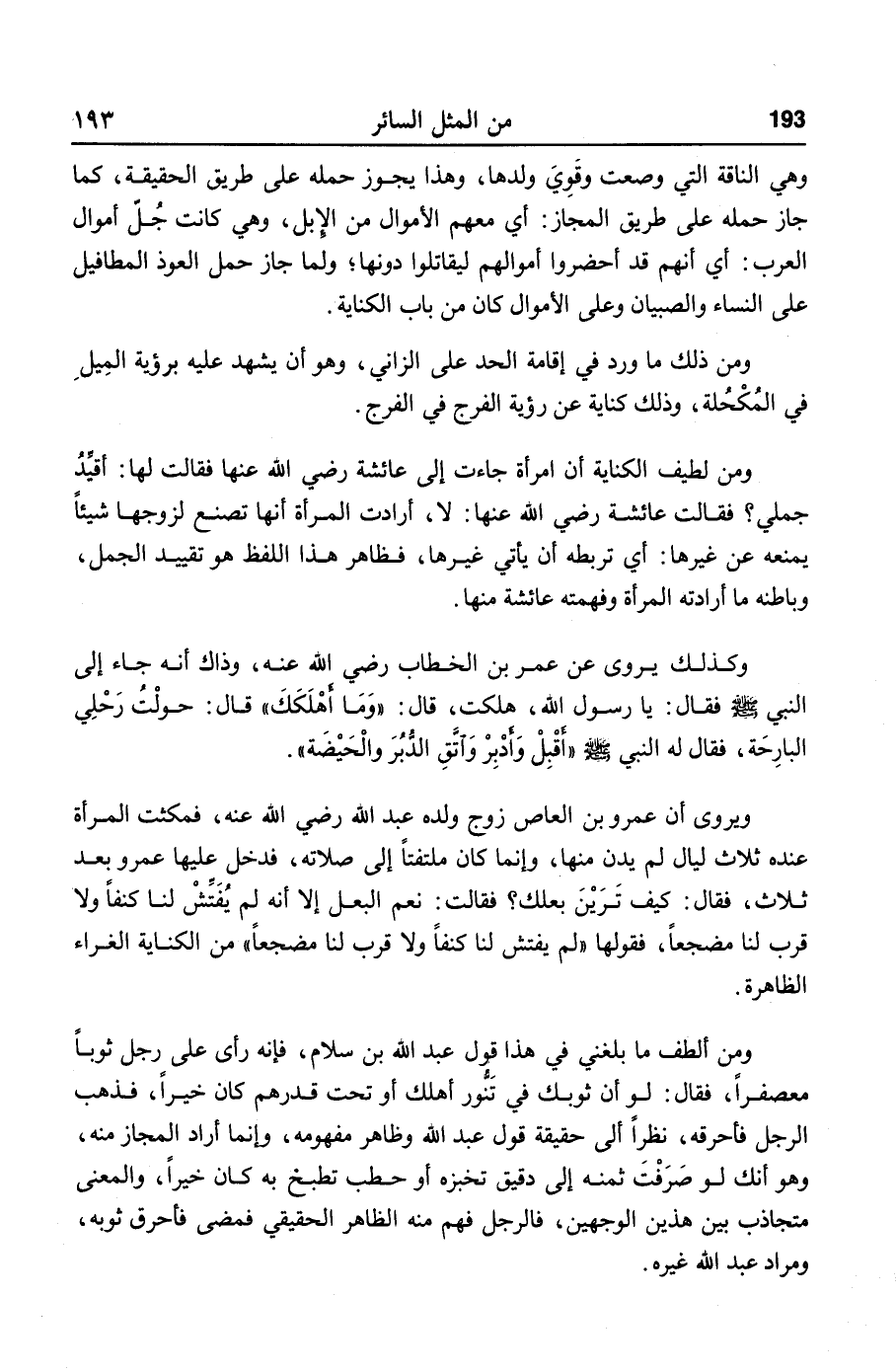 ويروى أن عمرو بن العاص زوج ولده عبد الله رضي الله عنه، فمكثت المرأة عنده ثلاث ليال لم يدن منها، وإنما كان ملتفتا إلى صلاته، فدخل عليها عمرو بعد ثلاث، فقال: كيف ترين بعلك؟ فقالت: نعم البعل إلا أنه لم يفتّش لنا كنفا ولا قرب لنا مضجعا، فقولها «لم يفتش لنا كنفا ولا قرب لنا مضجعا» من الكناية الغراء الظاهرة.