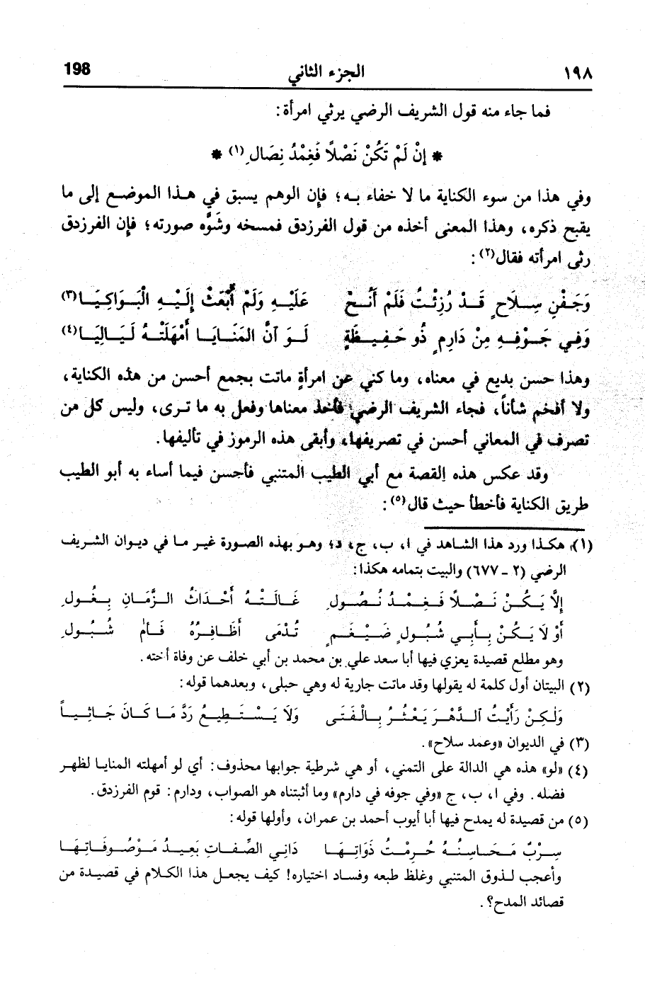 وقد عكس هذه القصة مع أبي الطيب المتنبي فأحسن فيما أساء به أبو الطيب طريق الكناية فأخطأ حيث قال «5» :