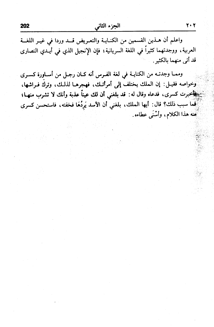 ومما وجدته من الكناية في لغة الفرس أنه كان رجل من أساورة كسرى وخواصه فقيل: إن الملك يختلف إلى امرأتك، فهجرها لذلك، وترك فراشها، فأخبرت كسرى، فدعاه وقال له: قد بلغني أن لك عينا عذبة وأنك لا تشرب منها؛ فما سبب ذلك؟ قال: أيها الملك، بلغني أن الأسد يردها فخفته، فاستحسن كسرى منه هذا الكلام، وأسنى عطاءه.