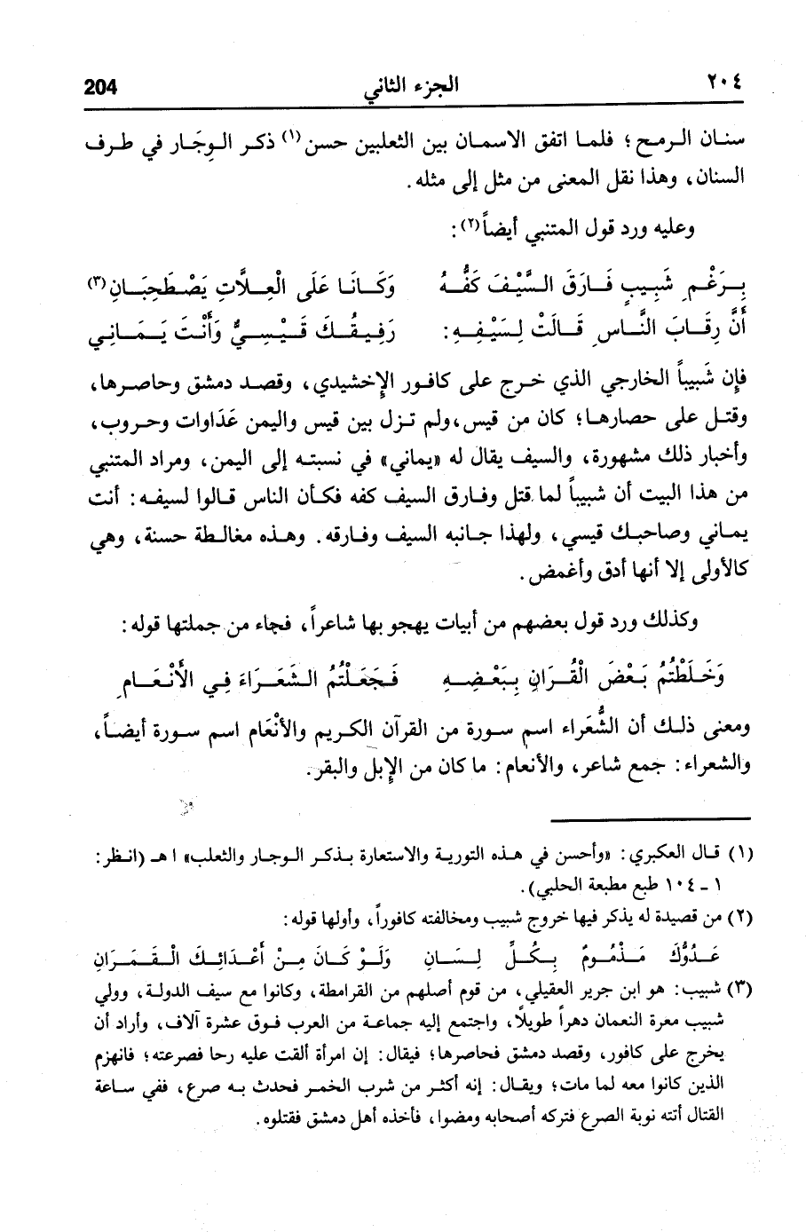 فإن شبيبا الخارجي الذي خرج على كافور الإخشيدي، وقصد دمشق وحاصرها، وقتل على حصارها؛ كان من قيس، ولم تزل بين قيس واليمن عداوات وحروب، وأخبار ذلك مشهورة، والسيف يقال له «يماني» في نسبته إلى اليمن، ومراد المتنبي من هذا البيت أن شبيبا لما قتل وفارق السيف كفه فكأن الناس قالوا لسيفه: أنت يماني وصاحبك قيسي، ولهذا جانبه السيف وفارقه. وهذه مغالطة حسنة، وهي كالأولى إلا أنها أدق وأغمض.