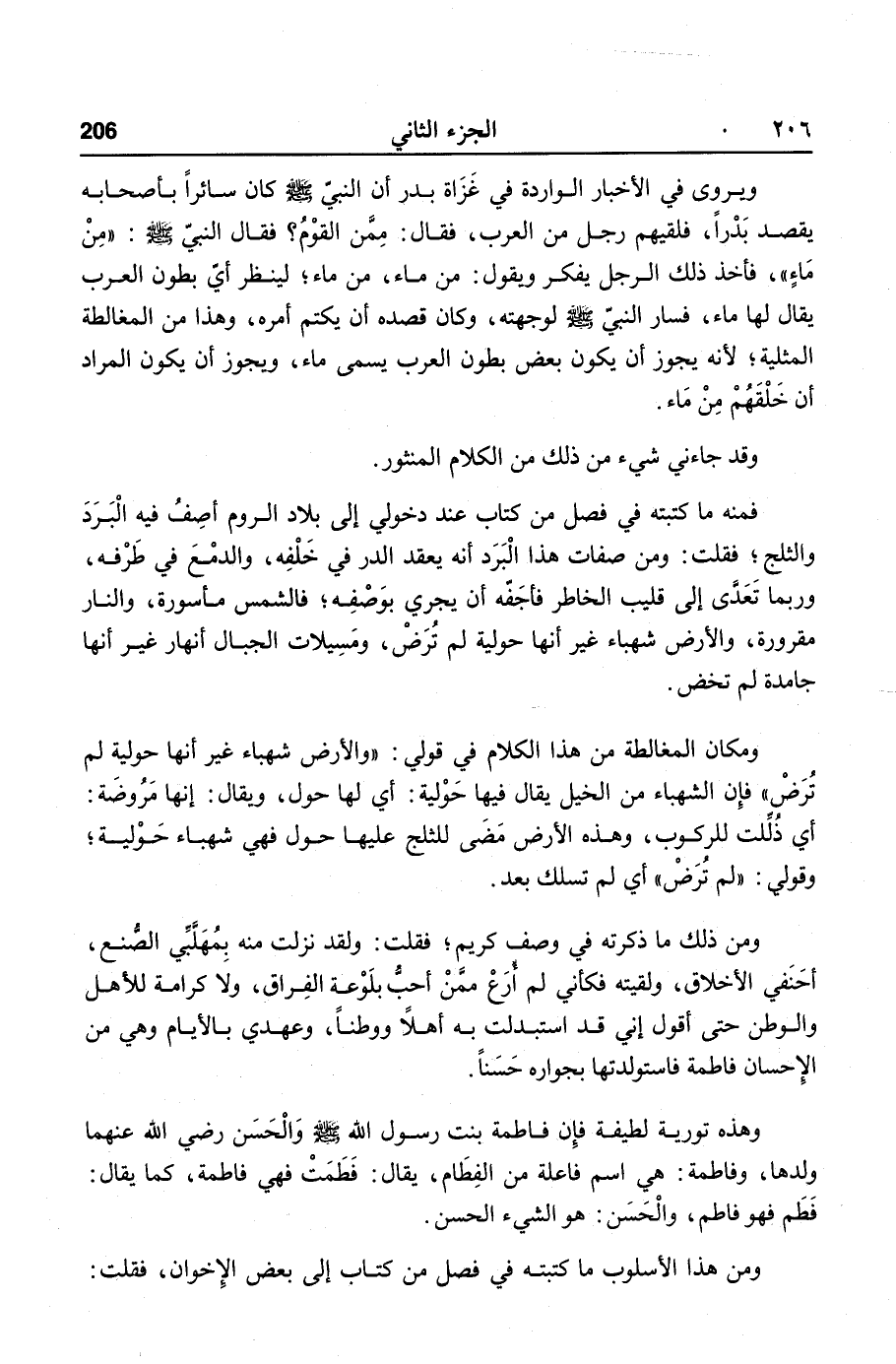 ومن ذلك ما ذكرته في وصف كريم؛ فقلت: ولقد نزلت منه بمهلّبّي الصّنع، أحنفي الأخلاق، ولقيته فكأني لم أرع ممّن أحبّ بلوعة الفراق، ولا كرامة للأهل والوطن حتى أقول إني قد استبدلت به أهلا ووطنا، وعهدي بالأيام وهي من الإحسان فاطمة فاستولدتها بجواره حسنا.