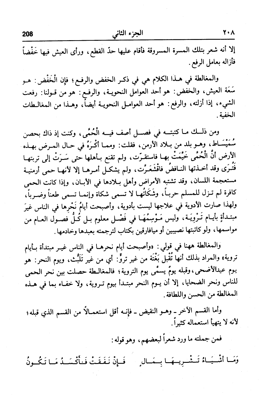 ومن ذلك ما كتبته في فصل أصف فيه الحمّى، وكنت إذ ذاك بحصن سميساط، وهو بلد من بلاد الأرمن، فقلت: ومما أكره في حال المرض بهذه الأرض أنّ الحمّى خيّمت بها فاستقرّت، ولم تقنع بأهلها حتى سرت إلى تربتها فترى وقد أخذتها النافض فاقشعرّت، ولم يشكل أمرها إلا لأنها حمى أرمنية مستعجمة اللسان، وقد تشتبه الأمراض وأهل بلادها في الأبان، وإذا كانت الحمى كافرة لم تزل للمسلم حربا، وشكاتها لا تسمى شكاة وإنما تسمى طعنا وضربا، ولهذا صارت الأدوية في علاجها ليست بأدوية، وأصبحت أيام نحرها في الناس غير مبتدأة بأيام تروية، وليس موسمها في فصل معلوم بل كلّ فصول العام من مواسمها، ولو كاتبتها نصيبين أو ميافارقين بكتاب لترجمته بعبدها وخادمها.