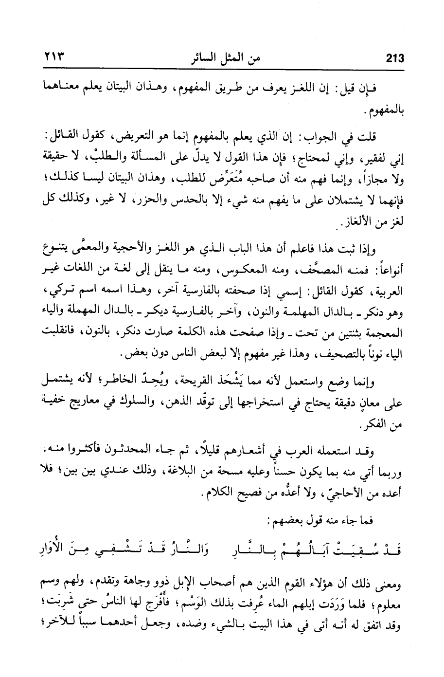 إني لفقير، وإني لمحتاج؛ فإن هذا القول لا يدلّ على المسألة والطلب، لا حقيقة ولا مجازا، وإنما فهم منه أن صاحبه متعرّض للطلب، وهذان البيتان ليسا كذلك؛ فإنهما لا يشتملان على ما يفهم منه شيء إلا بالحدس والحزر، لا غير، وكذلك كل لغز من الألغاز.