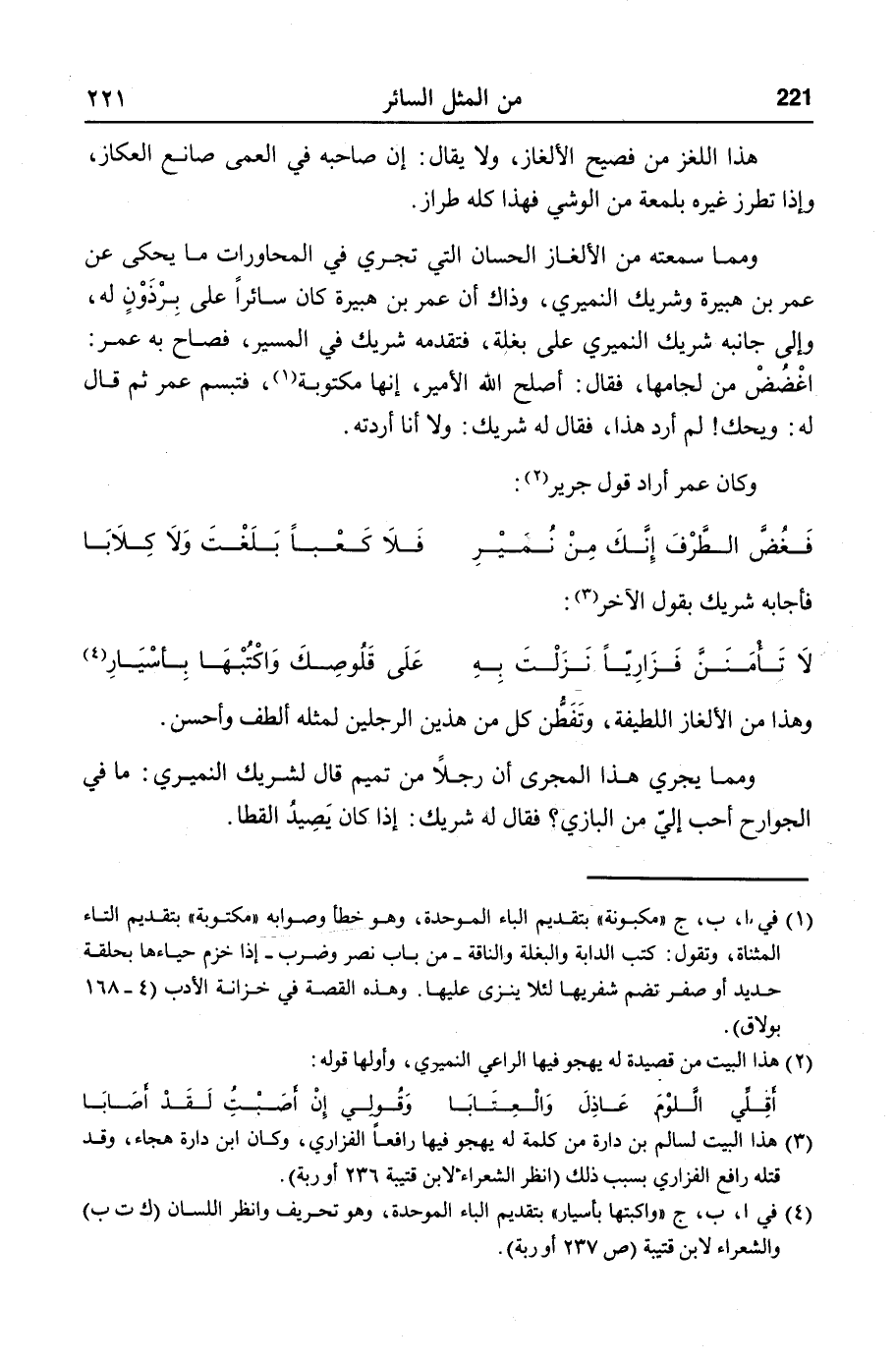 ومما سمعته من الألغاز الحسان التي تجري في المحاورات ما يحكى عن عمر بن هبيرة وشريك النميري، وذاك أن عمر بن هبيرة كان سائرا على برذون له، وإلى جانبه شريك النميري على بغلة، فتقدمه شريك في المسير، فصاح به عمر: