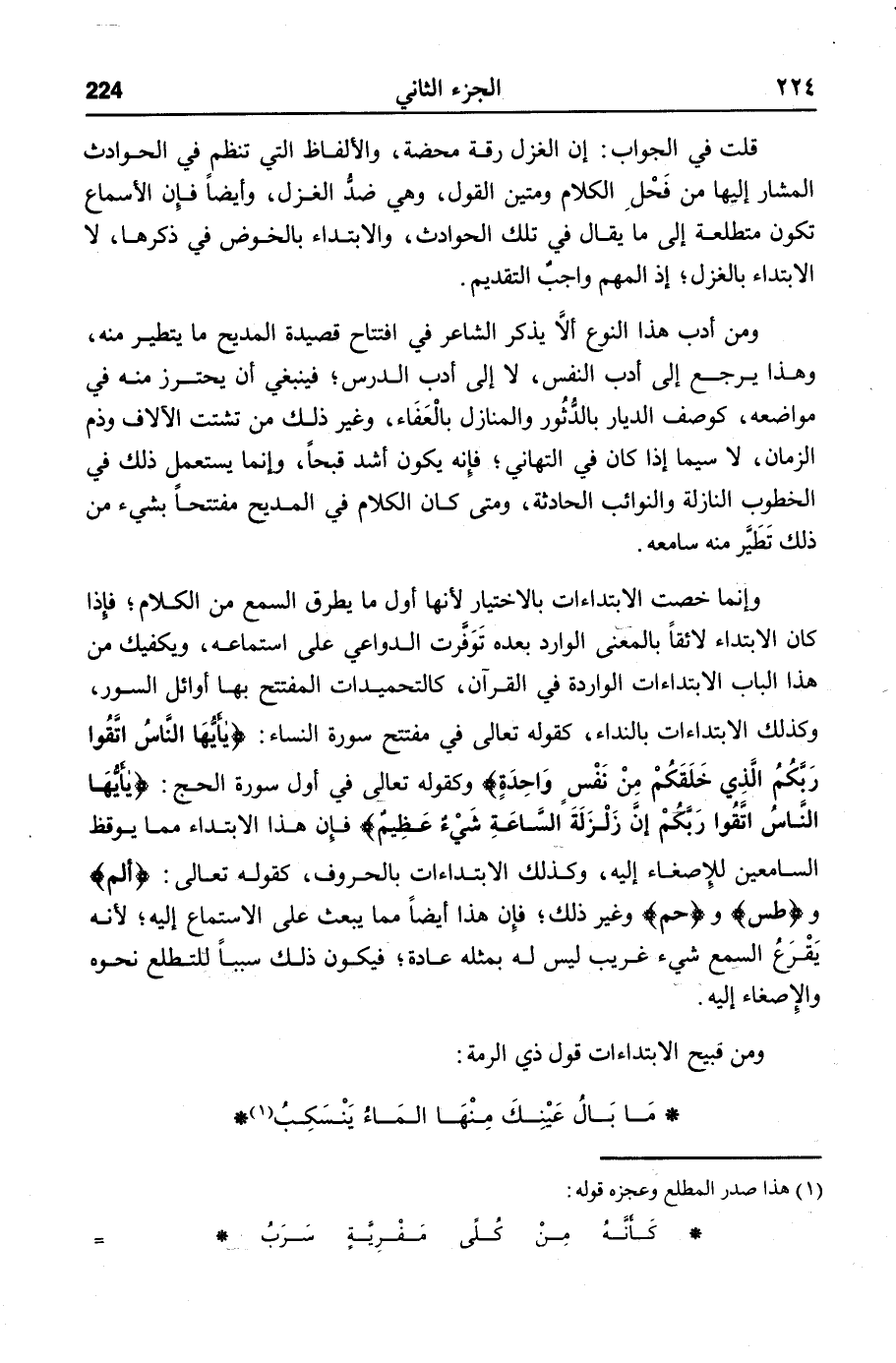 قلت في الجواب: إن الغزل رقة محضة، والألفاظ التي تنظم في الحوادث المشار إليها من فحل الكلام ومتين القول، وهي ضدّ الغزل، وأيضا فإن الأسماع تكون متطلعة إلى ما يقال في تلك الحوادث، والابتداء بالخوض في ذكرها، لا الابتداء بالغزل؛ إذ المهم واجب التقديم.