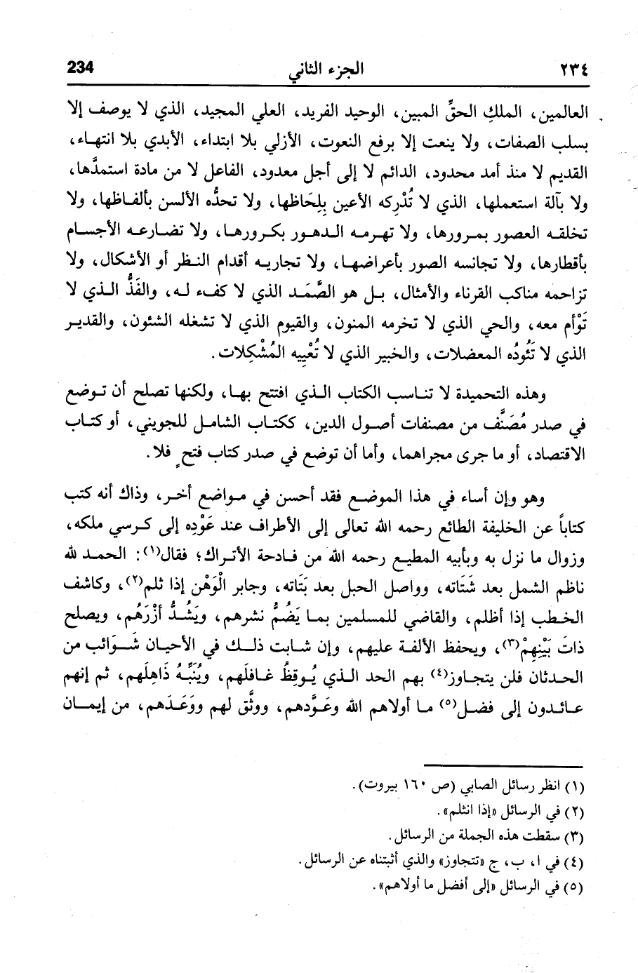 العالمين، الملك الحقّ المبين، الوحيد الفريد، العلي المجيد، الذي لا يوصف إلا بسلب الصفات، ولا ينعت إلا برفع النعوت، الأزلي بلا ابتداء، الأبدي بلا انتهاء، القديم لا منذ أمد محدود، الدائم لا إلى أجل معدود، الفاعل لا من مادة استمدّها، ولا بآلة استعملها، الذي لا تدركه الأعين بلحاظها، ولا تحدّه الألسن بألفاظها، ولا تخلقه العصور بمرورها، ولا تهرمه الدهور بكرورها، ولا تضارعه الأجسام بأقطارها، ولا تجانسه الصور بأعراضها، ولا تجاريه أقدام النظر أو الأشكال، ولا تزاحمه مناكب القرناء والأمثال، بل هو الصّمد الذي لا كفء له، والفذّ الذي لا توأم معه، والحي الذي لا تخرمه المنون، والقيوم الذي لا تشغله الشئون، والقدير الذي لا تئوده المعضلات، والخبير الذي لا تعييه المشكلات.