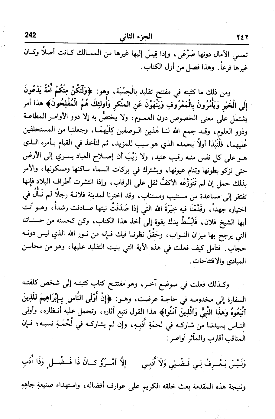 ومن ذلك ما كتبته في مفتتح تقليد بالحسبة، وهو: ولتكن منكم أمة يدعون إلى الخير ويأمرون بالمعروف وينهون عن المنكر وأولئك هم المفلحون