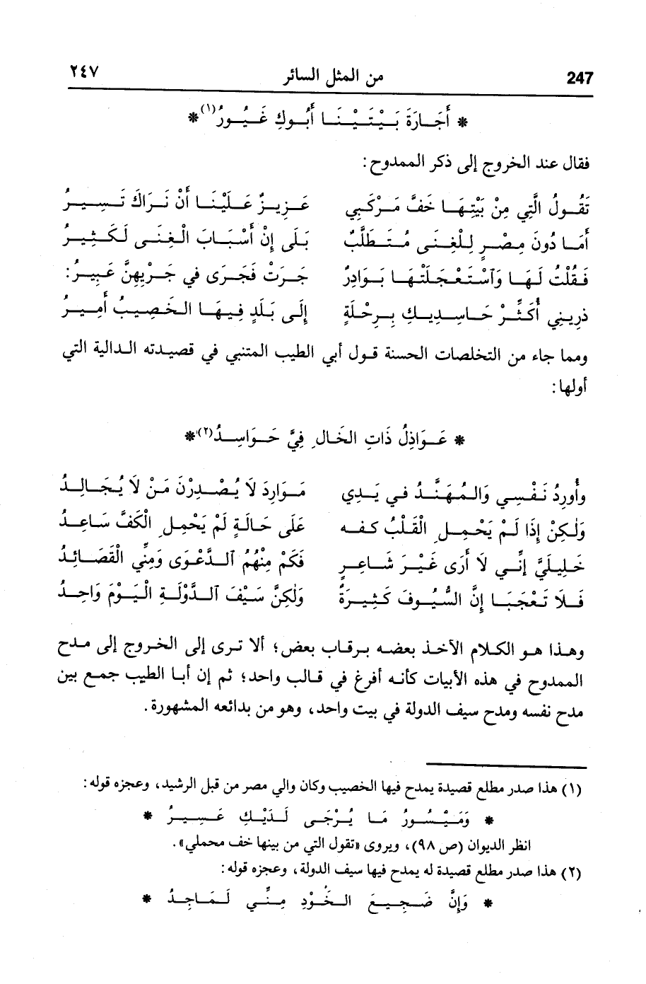 ومما جاء من التخلصات الحسنة قول أبي الطيب المتنبي في قصيدته الدالية التي أولها: