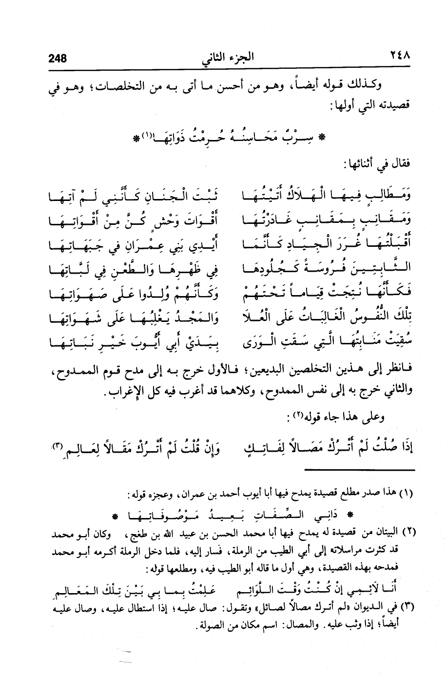 فانظر إلى هذين التخلصين البديعين؛ فالأول خرج به إلى مدح قوم الممدوح، والثاني خرج به إلى نفس الممدوح، وكلاهما قد أغرب فيه كل الإغراب.