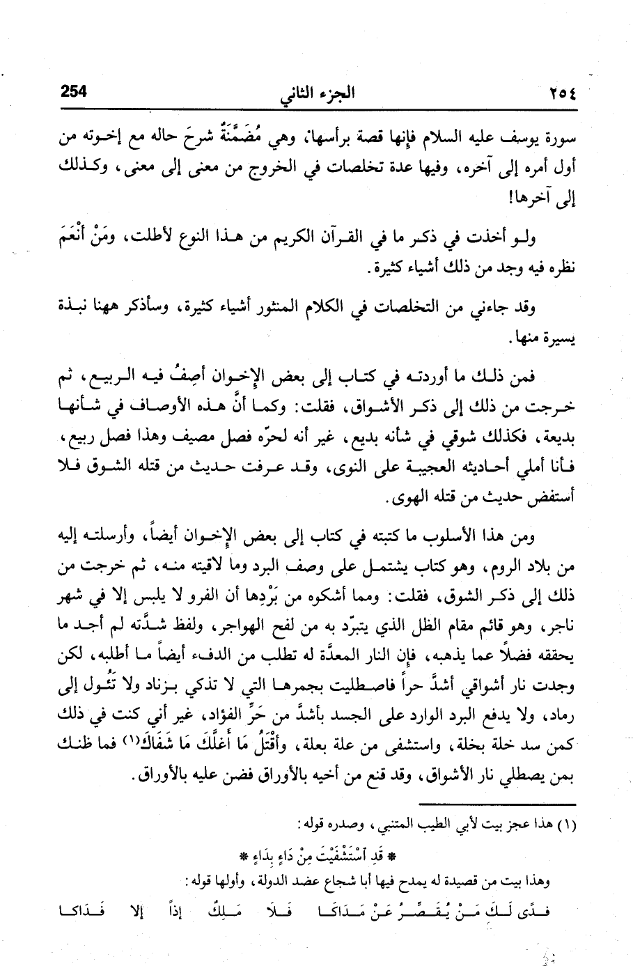 ومن هذا الأسلوب ما كتبته في كتاب إلى بعض الإخوان أيضا، وأرسلته إليه من بلاد الروم، وهو كتاب يشتمل على وصف البرد وما لاقيته منه، ثم خرجت من ذلك إلى ذكر الشوق، فقلت: ومما أشكوه من بردها أن الفرو لا يلبس إلا في شهر ناجر، وهو قائم مقام الظل الذي يتبرّد به من لفح الهواجر، ولفظ شدّته لم أجد ما يحققه فضلا عما يذهبه، فإن النار المعدّة له تطلب من الدفء أيضا ما أطلبه، لكن وجدت نار أشواقي أشدّ حرا فاصطليت بجمرها التي لا تذكي بزناد ولا تئول إلى رماد، ولا يدفع البرد الوارد على الجسد بأشدّ من حرّ الفؤاد، غير أني كنت في ذلك كمن سد خلة بخلة، واستشفى من علة بعلة، وأقتل ما أغلّك ما شفاك «1» فما ظنك بمن يصطلي نار الأشواق، وقد قنع من أخيه بالأوراق فضن عليه بالأوراق.