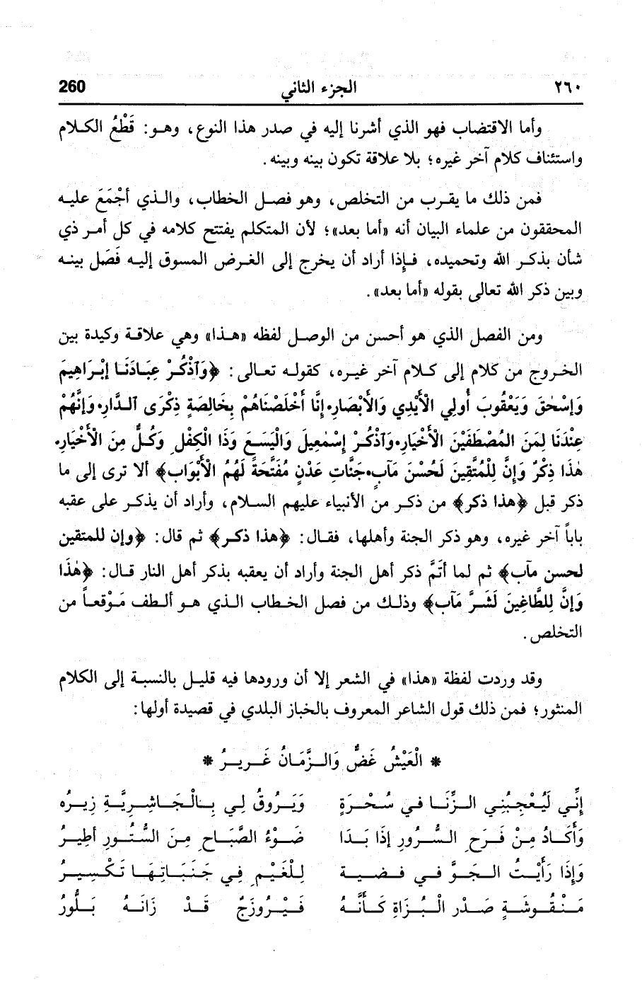 ومن الفضل الذي هو أحسن من الوصل لفظه «هذا» وهي علاقة وكيدة بين الخروج من كلام إلى كلام آخر غيره، كقوله تعالى: واذكر عبادنا إبراهيم وإسحاق ويعقوب أولي الأيدي والأبصار. إنا أخلصناهم بخالصة ذكرى الدار. وإنهم عندنا لمن المصطفين الأخيار. واذكر إسماعيل واليسع وذا الكفل وكل من الأخيار.