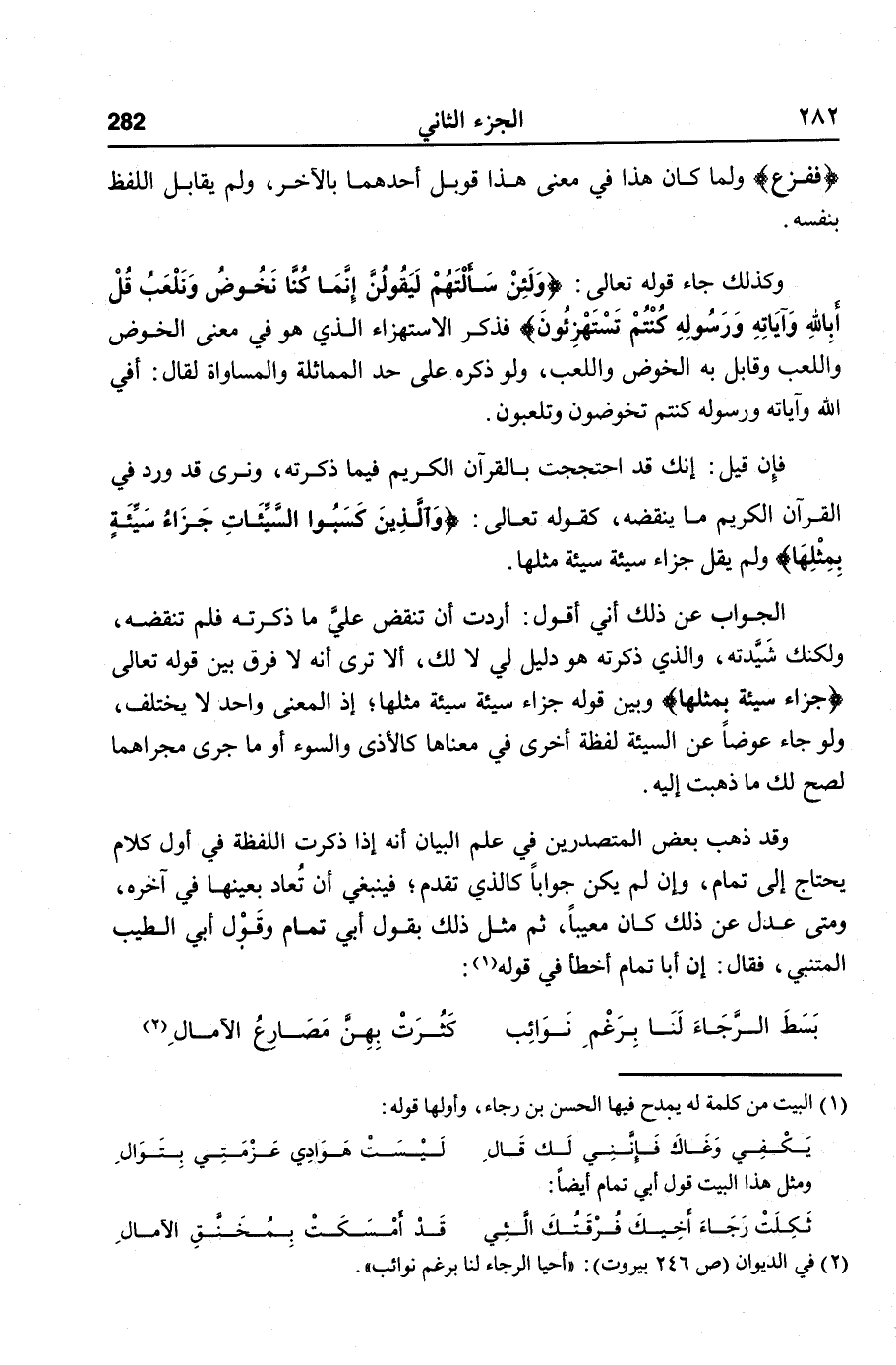 الجواب عن ذلك أني أقول: أردت أن تنقض عليّ ما ذكرته فلم تنقضه، ولكنك شيّدته، والذي ذكرته هو دليل لي لا لك، ألا ترى أنه لا فرق بين قوله تعالى جزاء سيئة بمثلها