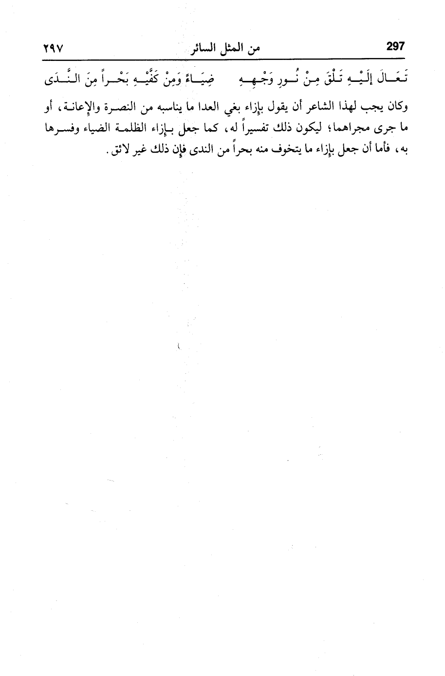وكان يجب لهذا الشاعر أن يقول بإزاء بغي العدا ما يناسبه من النصرة والإعانة، أو ما جرى مجراهما؛ ليكون ذلك تفسيرا له، كما جعل بإزاء الظلمة الضياء وفسرها به، فأما أن جعل بإزاء ما يتخوف منه بحرا من الندى فإن ذلك غير لائق.