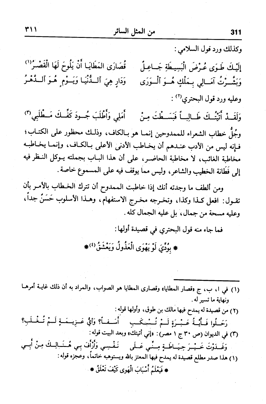 وجلّ خطاب الشعراء للممدوحين إنما هو بالكاف، وذلك محظور على الكتاب؛ فإنه ليس من الأدب عندهم أن يخاطب الأدنى الأعلى بالكاف، وإنما يخاطبه مخاطبة الغائب، لا مخاطبة الحاضر، على أن هذا الباب بجملته يوكل النظر فيه إلى فطانة الخطيب والشاعر، وليس مما يوقف فيه على المسموع خاصة.