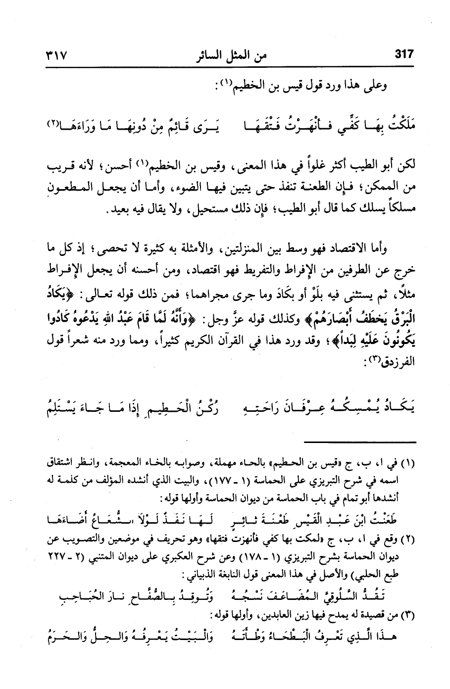 لكن أبو الطيب أكثر غلوا في هذا المعنى، وقيس بن الخطيم «2» أحسن؛ لأنه قريب من الممكن؛ فإن الطعنة تنفذ حتى يتبين فيها الضوء، وأما أن يجعل المطعون مسلكا يسلك كما قال أبو الطيب؛ فإن ذلك مستحيل، ولا يقال فيه بعيد.