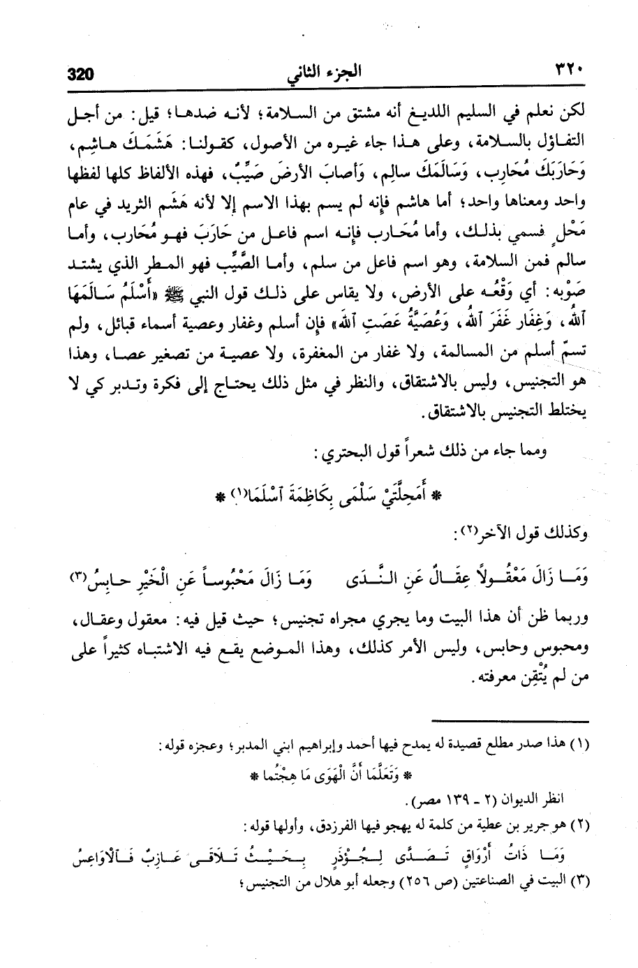 لكن نعلم في السليم اللديغ أنه مشتق من السلامة؛ لأنه ضدها؛ قيل: من أجل التفاؤل بالسلامة، وعلى هذا جاء غيره من الأصول، كقولنا: هشمك هاشم، وحاربك محارب، وسالمك سالم، وأصاب الأرض صيّب، فهذه الألفاظ كلها لفظها واحد ومعناها واحد؛ أما هاشم فإنه لم يسم بهذا الاسم إلا لأنه هشم الثريد في عام محل فسمي بذلك، وأما محارب فإنه اسم فاعل من حارب فهو محارب، وأما سالم فمن السلامة، وهو اسم فاعل من سلم، وأما الصّيّب فهو المطر الذي يشتد صوبه: أي وقعه على الأرض، ولا يقاس على ذلك قول النبي صلّى الله عليه وسلّم «أسلم سالمها الله، وغفار غفر الله، وعصيّة عصت الله» فإن أسلم وغفار وعصية أسماء قبائل، ولم تسمّ أسلم من المسالمة، ولا غفار من المغفرة، ولا عصية من تصغير عصا، وهذا هو التجنيس، وليس بالاشتقاق، والنظر في مثل ذلك يحتاج إلى فكرة وتدبر كي لا يختلط التجنيس بالاشتقاق.