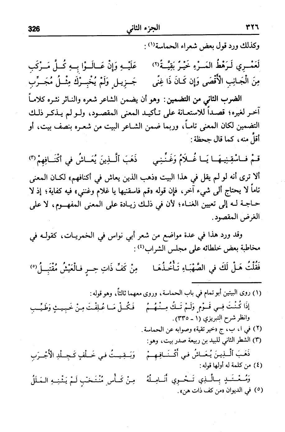 الضرب الثاني من التضمين: وهو أن يضمن الشاعر شعره والناثر نثره كلاما آخر لغيره؛ قصدا للاستعانة على تأكيد المعنى المقصود، ولو لم يذكر ذلك التضمين لكان المعنى تاما، وربما ضمن الشاعر البيت من شعره بنصف بيت، أو أقلّ منه، كما قال جحظة: