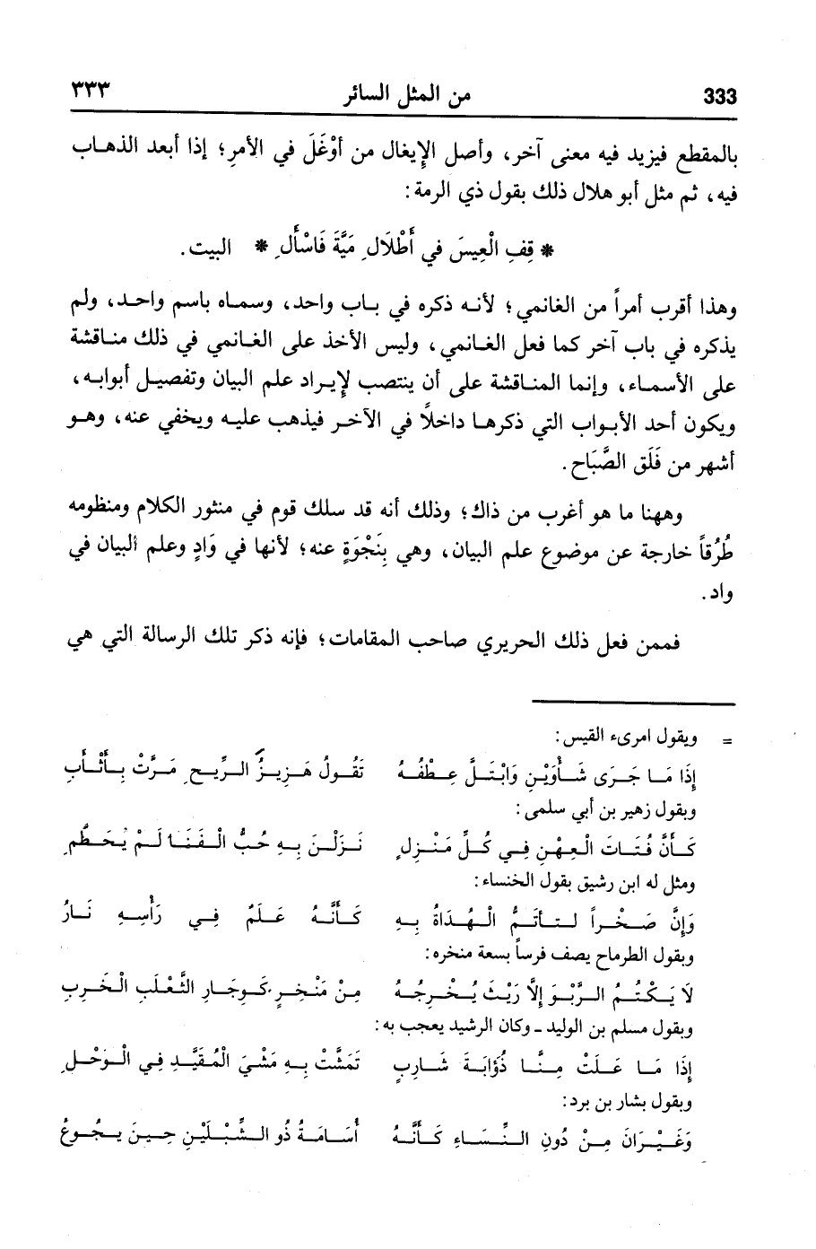 وهذا أقرب أمرا من الغانمي؛ لأنه ذكره في باب واحد، وسماه باسم واحد، ولم يذكره في باب آخر كما فعل الغانمي، وليس الأخذ على الغانمي في ذلك مناقشة على الأسماء، وإنما المناقشة على أن ينتصب لإيراد علم البيان وتفصيل أبوابه، ويكون أحد الأبواب التي ذكرها داخلا في الآخر فيذهب عليه ويخفي عنه، وهو أشهر من فلق الصّباح.