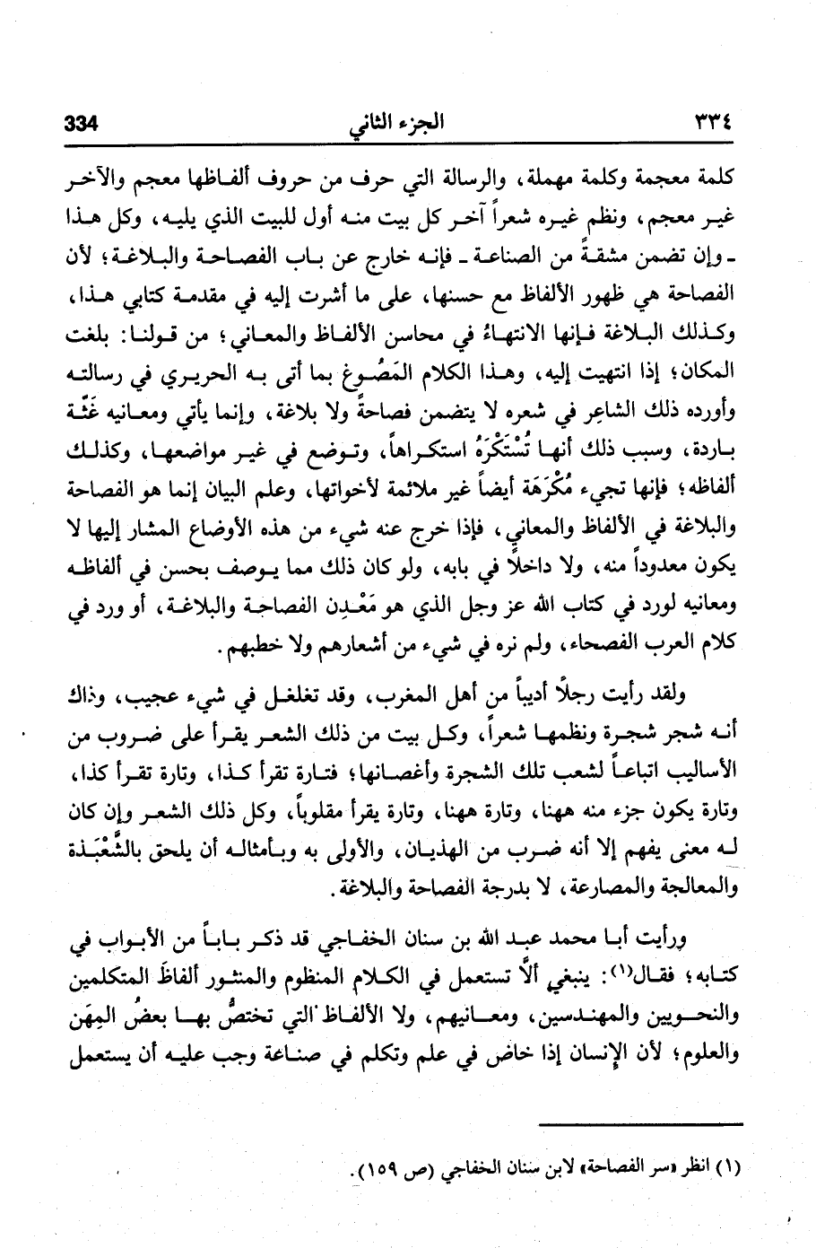 ورأيت أبا محمد عبد الله بن سنان الخفاجي قد ذكر بابا من الأبواب في كتابه؛ فقال «1» : ينبغي ألّا تستعمل في الكلام المنظوم والمنثور ألفاظ المتكلمين والنحويين والمهندسين، ومعانيهم، ولا الألفاظ التي تختصّ بها بعض المهن والعلوم؛ لأن الإنسان إذا خاض في علم وتكلم في صناعة وجب عليه أن يستعمل