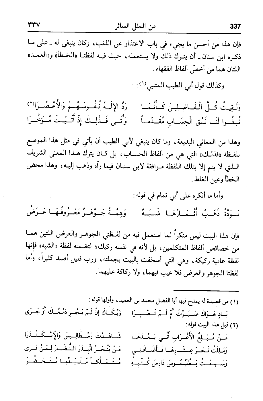 وهذا من المعاني البديعة، وما كان ينبغي لأبي الطيب أن يأتي في مثل هذا الموضع بلفظة «فذلك» التي هي من ألفاظ الحساب، بل كان يترك هذا المعنى الشريف الذي لا يتم إلا بتلك اللفظة موافقة لابن سنان فيما رآه وذهب إليه، وهذا محض الخطأ وعين الغلط.