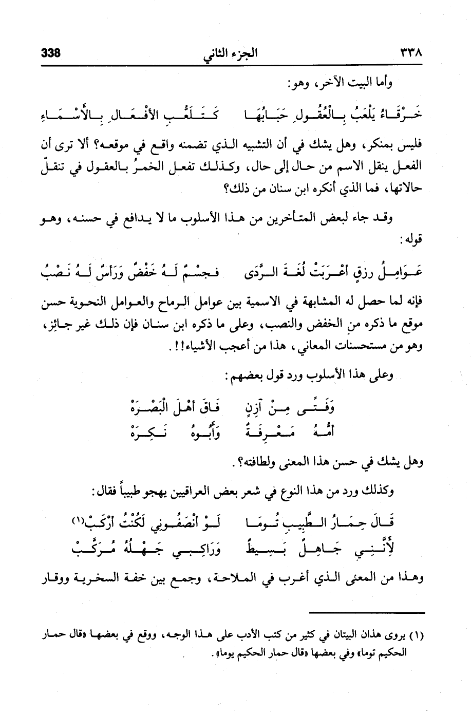 فإنه لما حصل له المشابهة في الاسمية بين عوامل الرماح والعوامل النحوية حسن موقع ما ذكره من الخفض والنصب، وعلى ما ذكره ابن سنان فإن ذلك غير جائز، وهو من مستحسنات المعاني، هذا من أعجب الأشياء!!.