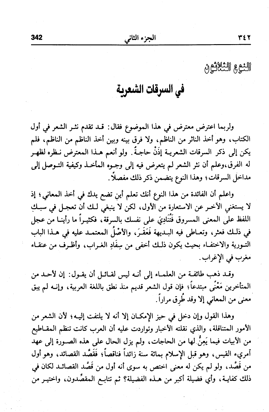 ولربما اعترض معترض في هذا الموضوع فقال: قد تقدم نثر الشعر في أول الكتاب، وهو أخذ الناثر من الناظم، ولا فرق بينه وبين أخذ الناظم من الناظم، فلم يكن إلى ذكر السرقات الشعرية إذن حاجة. ولو أنعم هذا المعترض نظره لظهر له الفرق، وعلم أن نثر الشعر لم يتعرض فيه إلى وجوه المأخذ وكيفية التوصل إلى مداخل السرقات؛ وهذا النوع يتضمن ذكر ذلك مفصلا.