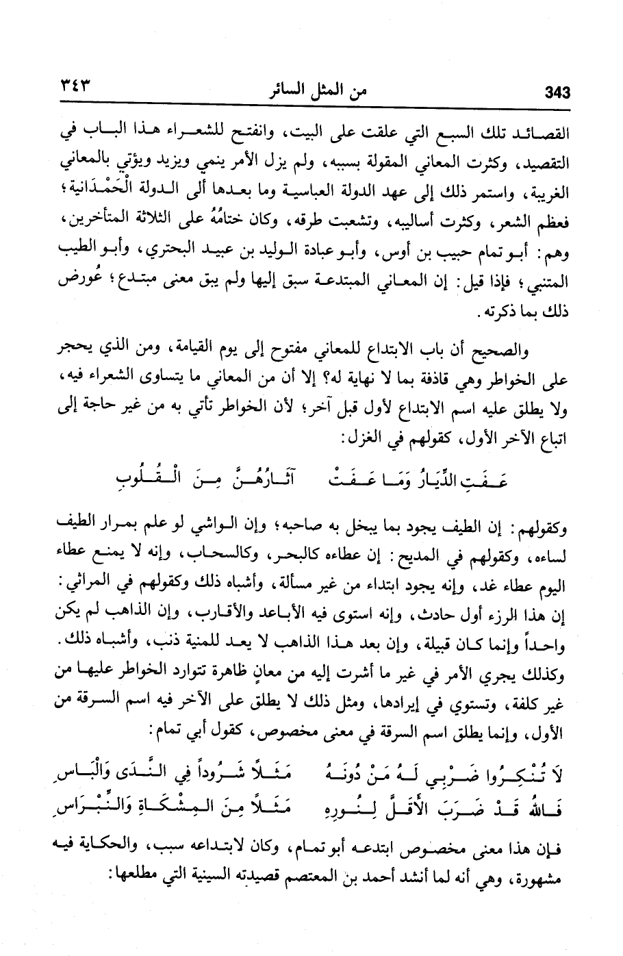 القصائد تلك السبع التي علقت على البيت، وانفتح للشعراء هذا الباب في التقصيد، وكثرت المعاني المقولة بسببه، ولم يزل الأمر ينمي ويزيد ويؤتي بالمعاني الغريبة، واستمر ذلك إلى عهد الدولة العباسية وما بعدها ألى الدولة الحمدانية؛ فعظم الشعر، وكثرت أساليبه، وتشعبت طرقه، وكان ختامه على الثلاثة المتأخرين، وهم: أبو تمام حبيب بن أوس، وأبو عبادة الوليد بن عبيد البحتري، وأبو الطيب المتنبي؛ فإذا قيل: إن المعاني المبتدعة سبق إليها ولم يبق معنى مبتدع؛ عورض ذلك بما ذكرته.