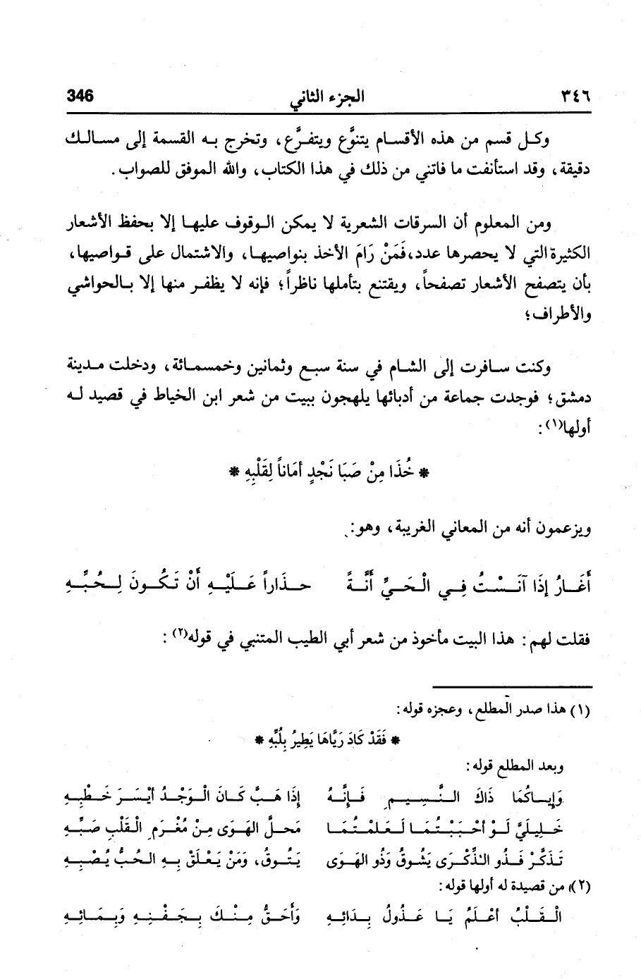 ومن المعلوم أن السرقات الشعرية لا يمكن الوقوف عليها إلا بحفظ الأشعار الكثيرة التي لا يحصرها عدد، فمن رام الأخذ بنواصيها، والاشتمال على قواصيها، بأن يتصفح الأشعار تصفحا، ويقتنع بتأملها ناظرا؛ فإنه لا يظفر منها إلا بالحواشي والأطراف؛ وكنت سافرت إلى الشام في سنة سبع وثمانين وخمسمائة، ودخلت مدينة دمشق؛ فوجدت جماعة من أدبائها يلهجون ببيت من شعر ابن الخياط في قصيد له أولها «1» :