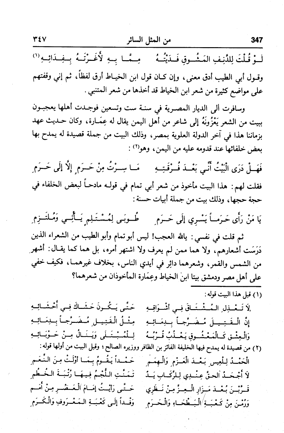 ثم قلت في نفسي: بالله العجب! ليس أبو تمام وأبو الطيب من الشعراء الذين درست أشعارهم، ولا هما ممن لم يعرف ولا اشتهر أمره، بل هما كما يقال: أشهر من الشمس والقمر، وشعرهما دائر في أيدي الناس، بخلاف غيرهما، فكيف خفي على أهل مصر ودمشق بيتا ابن الخياط وعمارة المأخوذان من شعرهما؟