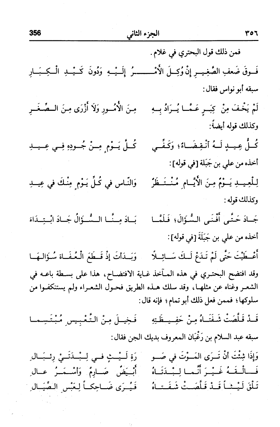 وقد افتضح البحتري في هذه المآخذ غاية الافتضاح، هذا على بسطة باعه في الشعر وغناه عن مثلها، وقد سلك هذه الطريق فحول الشعراء ولم يستنكفوا من سلوكها؛ فممن فعل ذلك أبو تمام؛ فإنه قال: