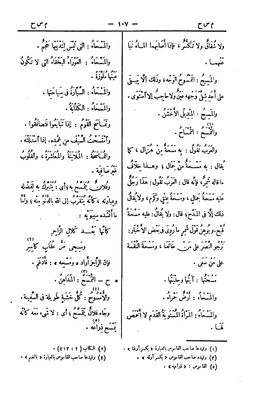 والمَسْحَاءُ: المَرْأةُ المُسْتَويَةُ القَدَم لا أَخْمَصَ لَهَا.