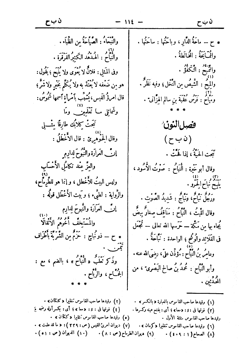 وقال اللَّيثُ، النَّبَّاحُ: مَنَاقِفُ صِغارٌ بِيضٌ يُجاء بها مِن مَكَّة - حَرَسها الله تعالى - تُجْعَل في القَلائِد والوُشُح؛ الواحدة: نَبَّاحَةٌ.