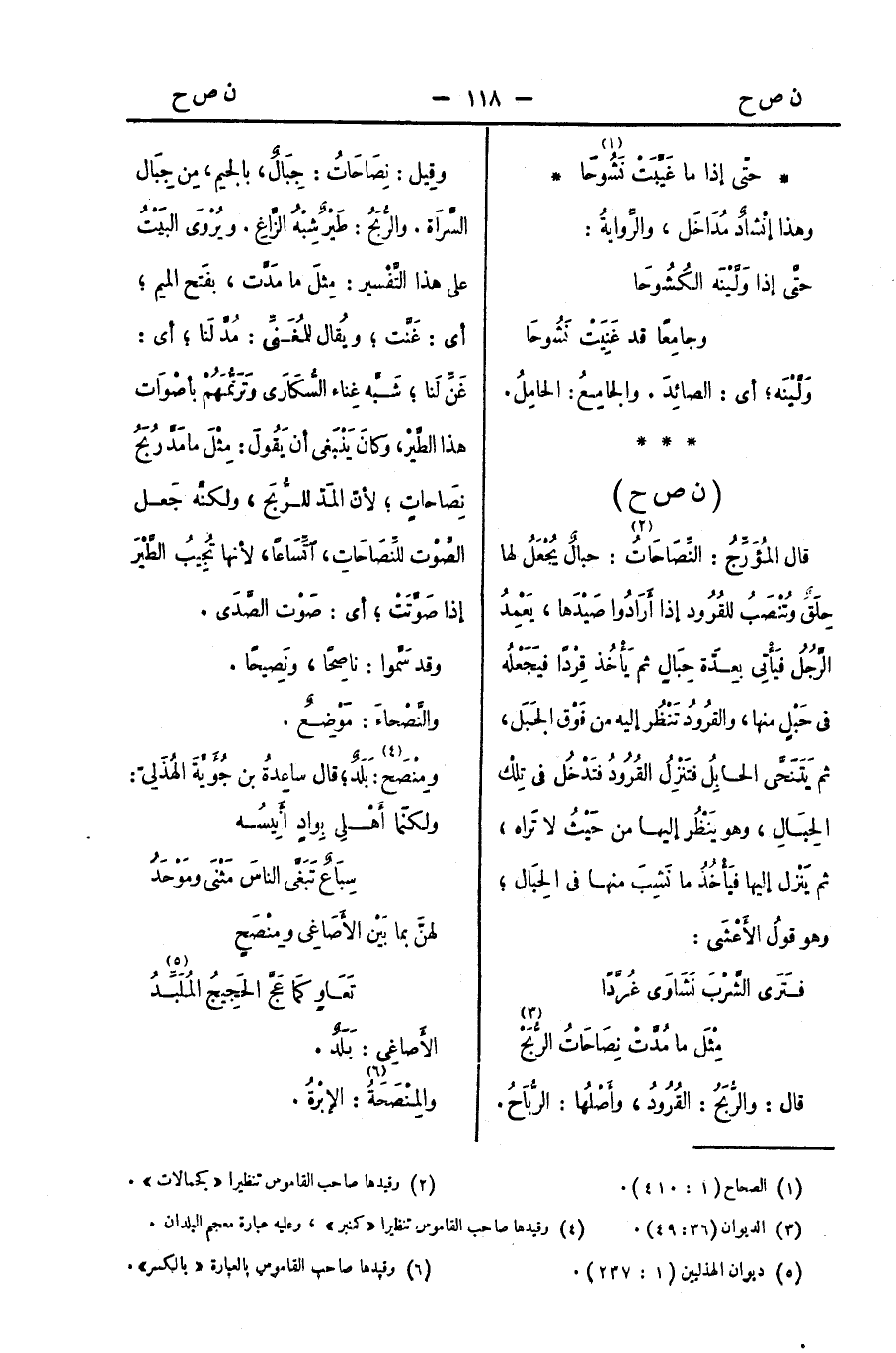 وقِيل: نِصَاحَاتُ: جِبَالٌ، بالجيم، من جِبَال السَّرَاة. والرُّبَحُ: طَيْرٌ شِبْهُ الزَّاغِ. ويُرْوَى البَيْتُ على هذا التَّفْسير: مِثلَ ما مَدَّت، بفَتح الميم؛ أي: غَنَّت؛ ويُقال للمُغَنِّي: مُدَّ لَنا؛ أي: غَنِّ لَنا؛ شَبَّه غِناء السُّكَارَى وتَرَنُّمَهُم بأصْوَات هذا الطَّيْر، وكانَ يَنْبَغي أن يَقُولَ: مِثْلَ ما مَدَّ رُبَحُ نِصَاحاتٍ؛ لأنّ المَدّ للرُّبَح، ولكنَّه جَعل الصَّوْت للنِّصَاحَاتِ، اتِّسَاعًا، لأنها تُجِيبُ الطَّيْرَ إذا صَوَّتَتْ؛ أي: صَوْت الصَّدَى.