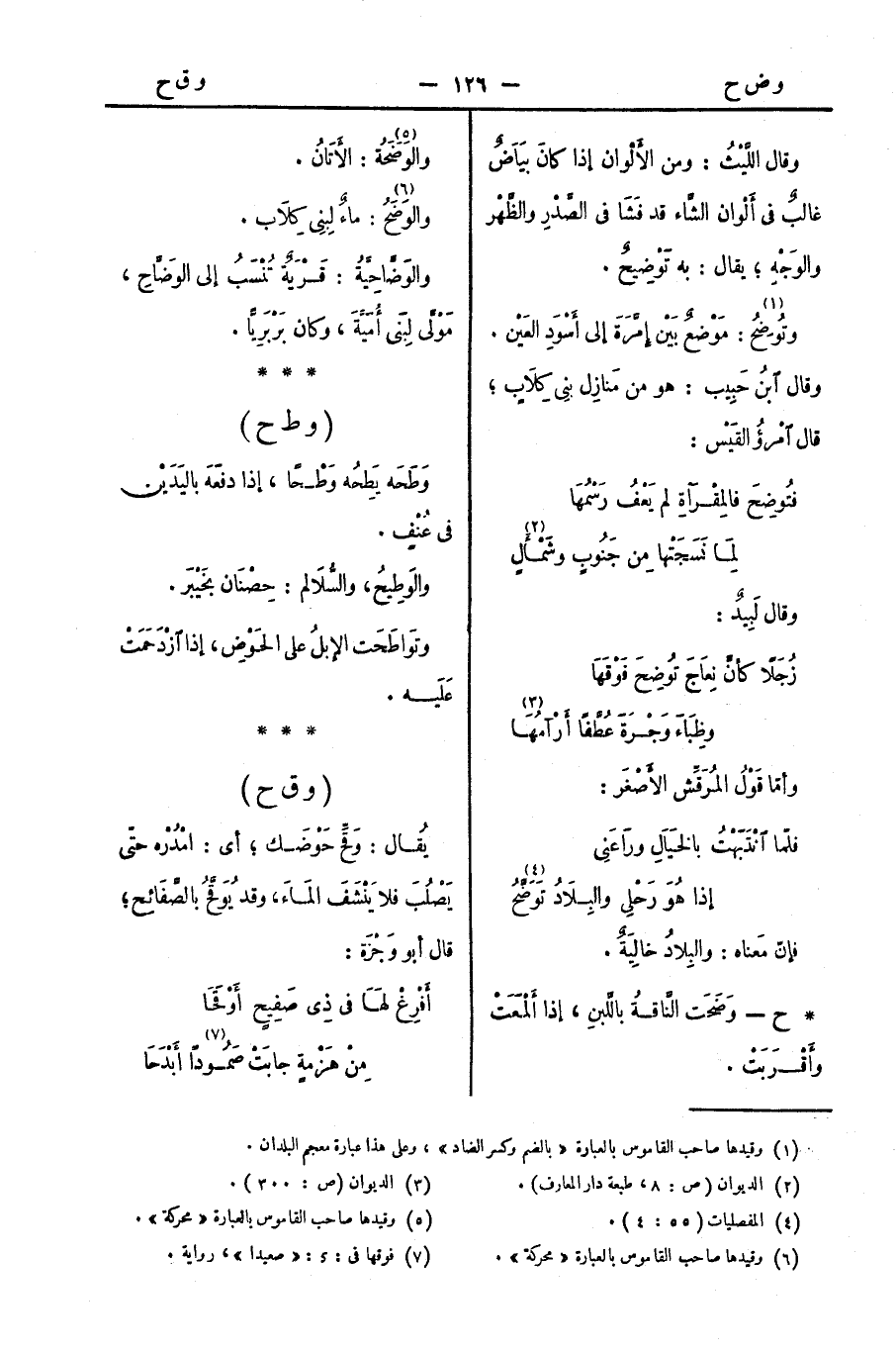 وقال اللَّيْثُ: ومن الأَلْوان إذا كانَ بَيَاضٌ غالبٌ في أَلْوان الشَّاء قد فَشَا في الصَّدْرِ والظَّهْر والوَجْهِ؛ يقال: به تَوْضِيحٌ.