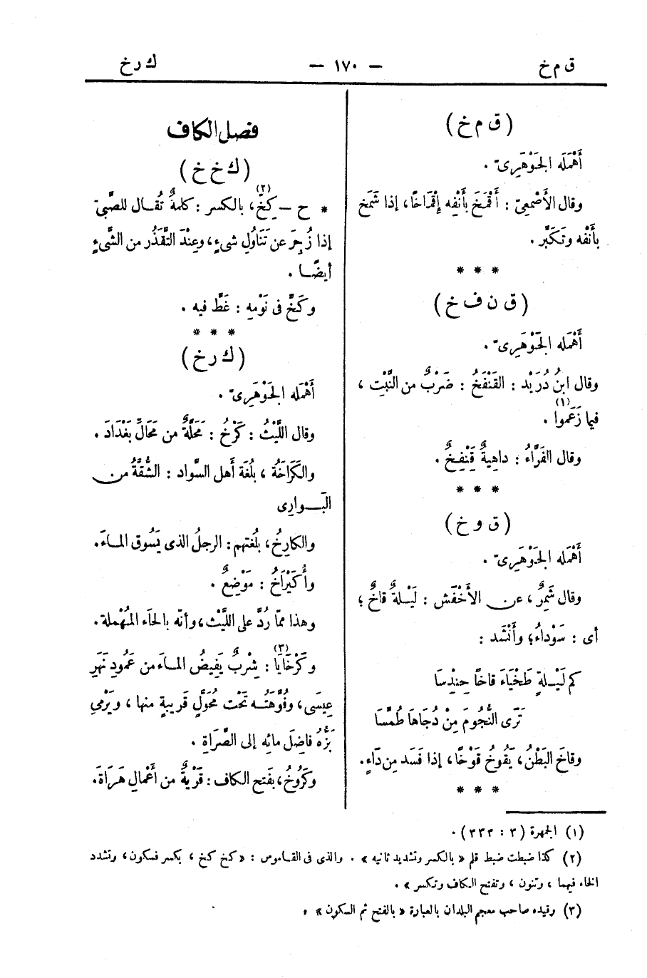 * ح - كِخّ، بالكسر: كلمةٌ تُقال للصَّبيّ إذا زُجِرَ عن تَنَاوُلِ شيءٍ، وعِنْدَ التَّقَذُّر من الشَّيءِ أيضًا.