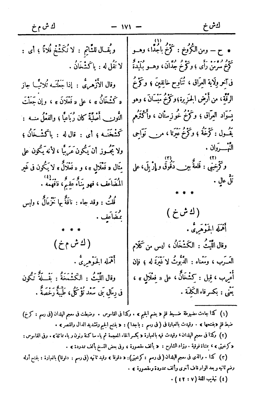 وقال اللَّيْثُ: الكَشْخَانُ، ليس من كَلام العَرَب، ومَعْناه: الدَّيُّوثُ لا غَيْرَةَ له؛ فإن أُعْرِب، قِيل: كِشْخَانٌ، على " فِعْلالٍ "، يَعْني: بكسر فاء الكَلِمَة.