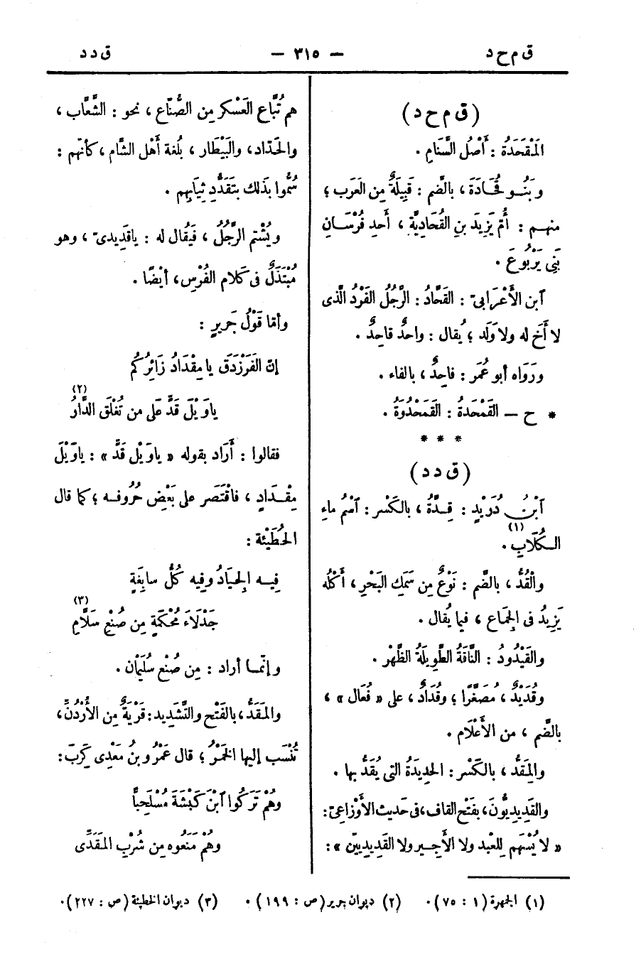 والقَدِيدِيُّونَ، بفَتْح القاف، في حَديث الأَوْزاعِيّ: " لا يُسْهَم لِلعبْد ولا الأَجِير ولا القَدِيدِيّين ": هم تُبَّاع العَسْكر مِن الصُّنّاع، نحو: الشَّعّاب، والحَدّاد، والبَيْطَار، بلُغة أَهْل الشَّام، كأنّهم: سُمُّوا بذَلك بتَقَدُّدِ ثِيَابِهم.