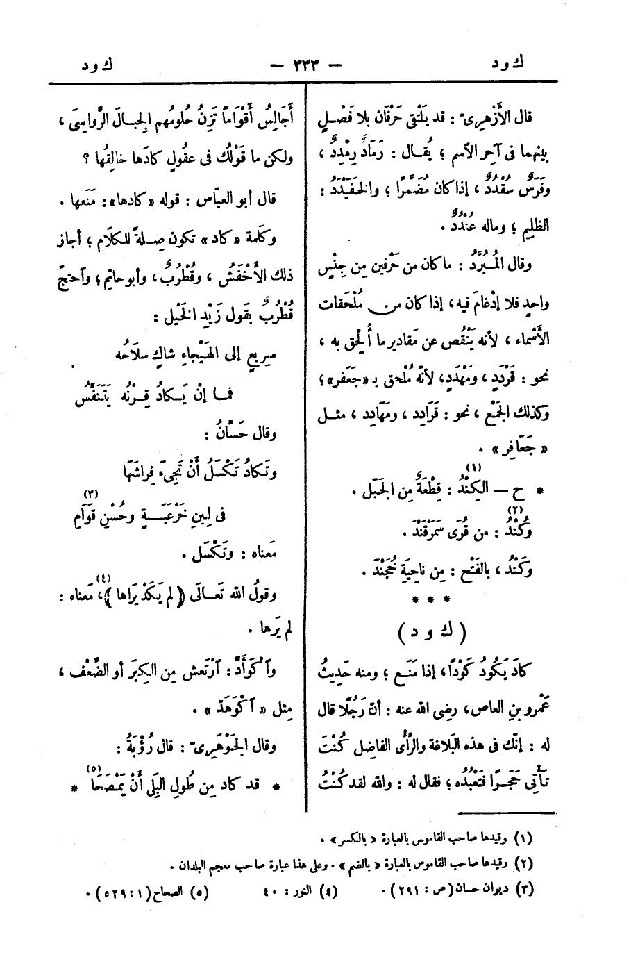 كادَ يَكُودُ كَوْدًا، إذا مَنَع؛ ومنه حَدِيثُ عَمْرو بنِ العاص، رضِي الله عنه: أنّ رَجُلًا قال له: إنّك في هذه البَلاغة والرَّأْي الفاضِل كُنْتَ تَأْتِي حَجَرًا فتَعْبُدُه؛ فقال له: والله لقد كُنْتُ أُجَالِسُ أَقْوَامًا تَزِنُ حُلومُهم الجِبالَ الرَّواسِيَ، ولكن ما قَوْلُك في عُقولٍ كادَها خالِقُها؟