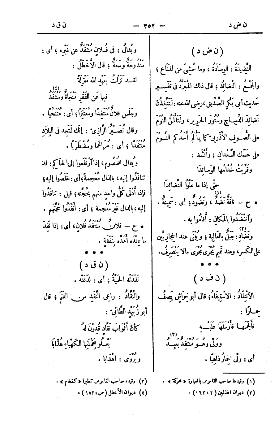 ويُقالُ: في فُلانٍ مُنْتَفَدٌ عن غَيْرِه؛ أي: مَنْدُوحَةٌ وسَعَةٌ؛ قال الأَخْطَلُ: