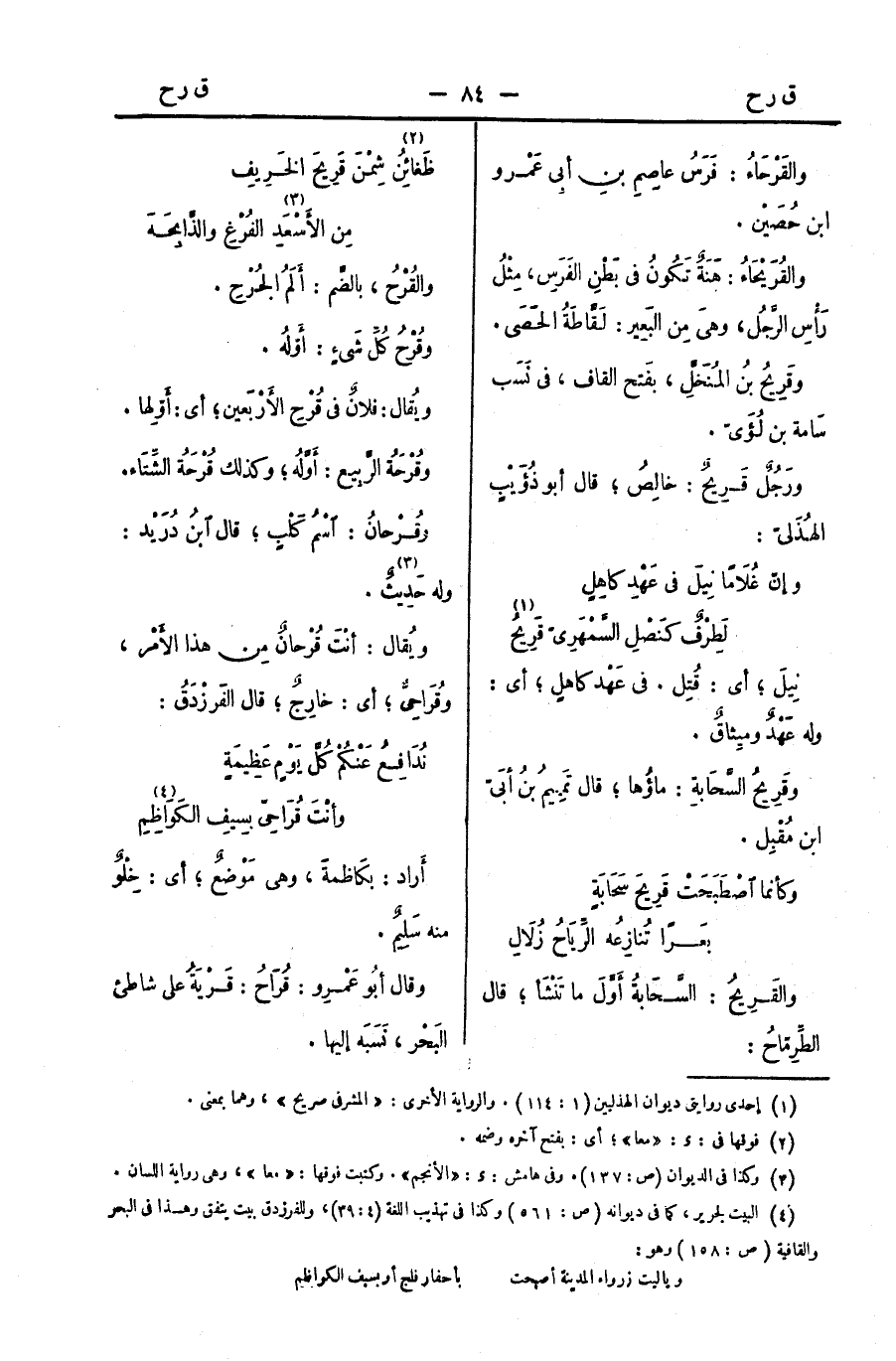 ويُقال: أنْتَ قُرْحانٌ مِن هذا الأَمْر، وقُرَاحِيٌّ؛ أي: خارِجٌ؛ قال الفَرزْدَقُ: