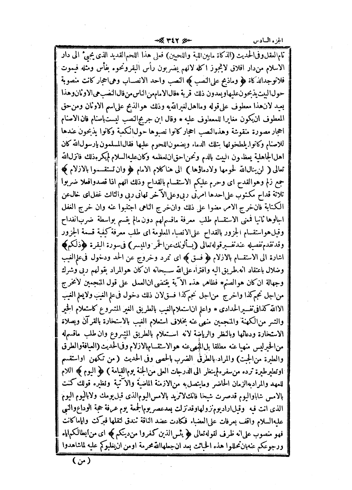 تام العقل وفى الحديث (الذكاة ما بين اللبة واللحيين) فعلى هذا اللحم القديد الذي يجيئ الى دار الإسلام من دار افلاق لا يجوز أكله لانهم يضربون رأس البقر ونحوه بفأس ومثله فيموت فلا توجد الذكاة وَما ذُبِحَ عَلَى النُّصُبِ النصب واحد الأنصاب وهى أحجار كانت منصوبة حول البيت يذبحون عليها ويعدون ذلك قربة قال الامام من الناس من قال النصب هى الأوثان وهذا بعيد لان هذا معطوف على قوله وما اهل لغير الله به وذلك هو الذبح على اسم الأوثان ومن حق المعطوف ان يكون مغايرا للمعطوف عليه. وقال ابن جريج النصب ليست بأصنام فان الأصنام أحجار مصورة منقوشة وهذه النصب أحجار كانوا نصبوها حول الكعبة وكانوا يذبحون عندها للاصنام وكانوا يلطخونها بتلك الدماء ويضعون اللحوم عليها فقال المسلمون يا رسول الله كان اهل الجاهلية يعظمون البيت بالدم ونحن أحق ان نعظمه وكان عليه السلام لم يكره ذلك فانزل الله تعالى لَنْ يَنالَ اللَّهَ لُحُومُها وَلا دِماؤُها الى هنا كلام الامام وَأَنْ تَسْتَقْسِمُوا بِالْأَزْلامِ جمع زلم وهو القدح اى وحرم عليكم الاستقسام بالقداح وذلك انهم إذا قصدوا فعلا ضربوا ثلاثة قداح مكتوب على أحدها أمرني ربى وعلى الآخر نهانى ربى والثالث غفل اى خال عن الكتابة فان خرج الأمر مضوا على ذلك وان خرج الناهي اجتنبوا عنه وان خرج الغفل اجالوها ثانيا فمعنى الاستقسام طلب معرفة ما قسم لهم دون ما لم يقسم بواسطة ضرب القداح وقيل هو استقسام الجزور بالقداح على الأنصباء المعلومة اى طلب معرفة كيفية قسمة الجزور وقد تقدم تفصيله عند تفسير قوله تعالى يَسْئَلُونَكَ عَنِ الْخَمْرِ وَالْمَيْسِرِ فى سورة البقرة ذلِكُمْ اشارة الى الاستقسام بالأزلام فِسْقٌ اى تمرد وخروج عن الحد ودخول فى علم الغيب وضلال باعتقاد انه طريق اليه وافتراء على الله سبحانه ان كان هو المراد بقولهم ربى وشرك وجهالة ان كان هو الصنم. فظاهر هذه الآية يقتضى ان العمل على قول المنجمين لا تخرج من أجل نجم كذا واخرج من أجل نجم كذا فسق لان ذلك دخول فى علم الغيب ولا يعلم الغيب الا الله كذا فى تفسير الحدادي. واعلم ان استعلام الغيب بالطريق الغير المشروع كاستعلام الخير والشر من الكهنة والمنجمين منهى عنه بخلاف